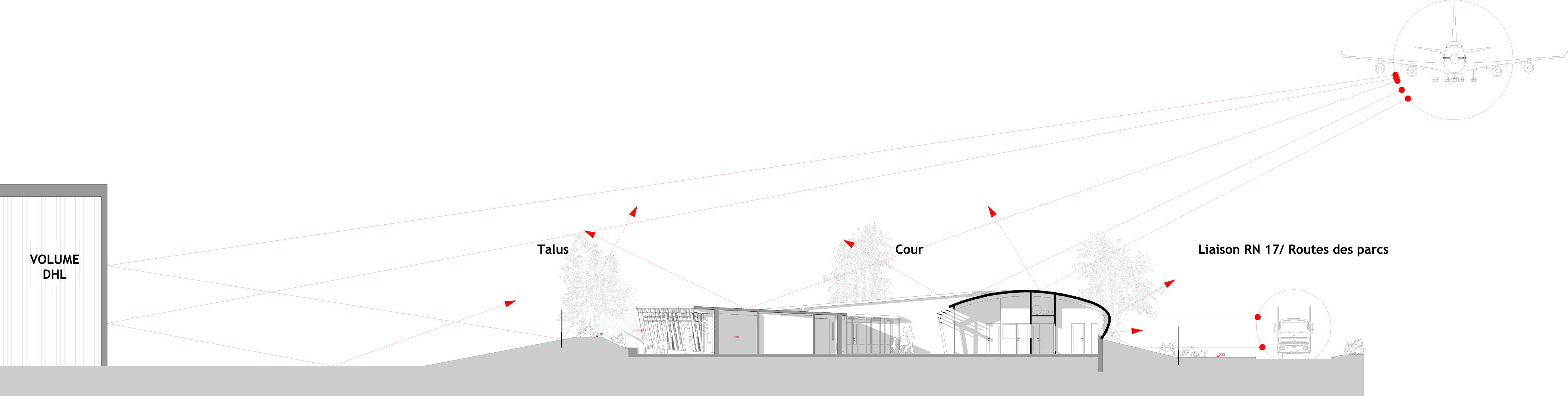 J’ai donc imaginé cette toiture en forme de profil d’aile d’avion qui caractérise le projet en faisant écran à la fois au trafic aérien et routier. Coté jardin, un talus vient compléter le dispositif. Les espaces de vie sont ainsi protégés des nuisances sonores tout en étant parfaitement orientés pour bénéficier d’un ensoleillement maximal.
